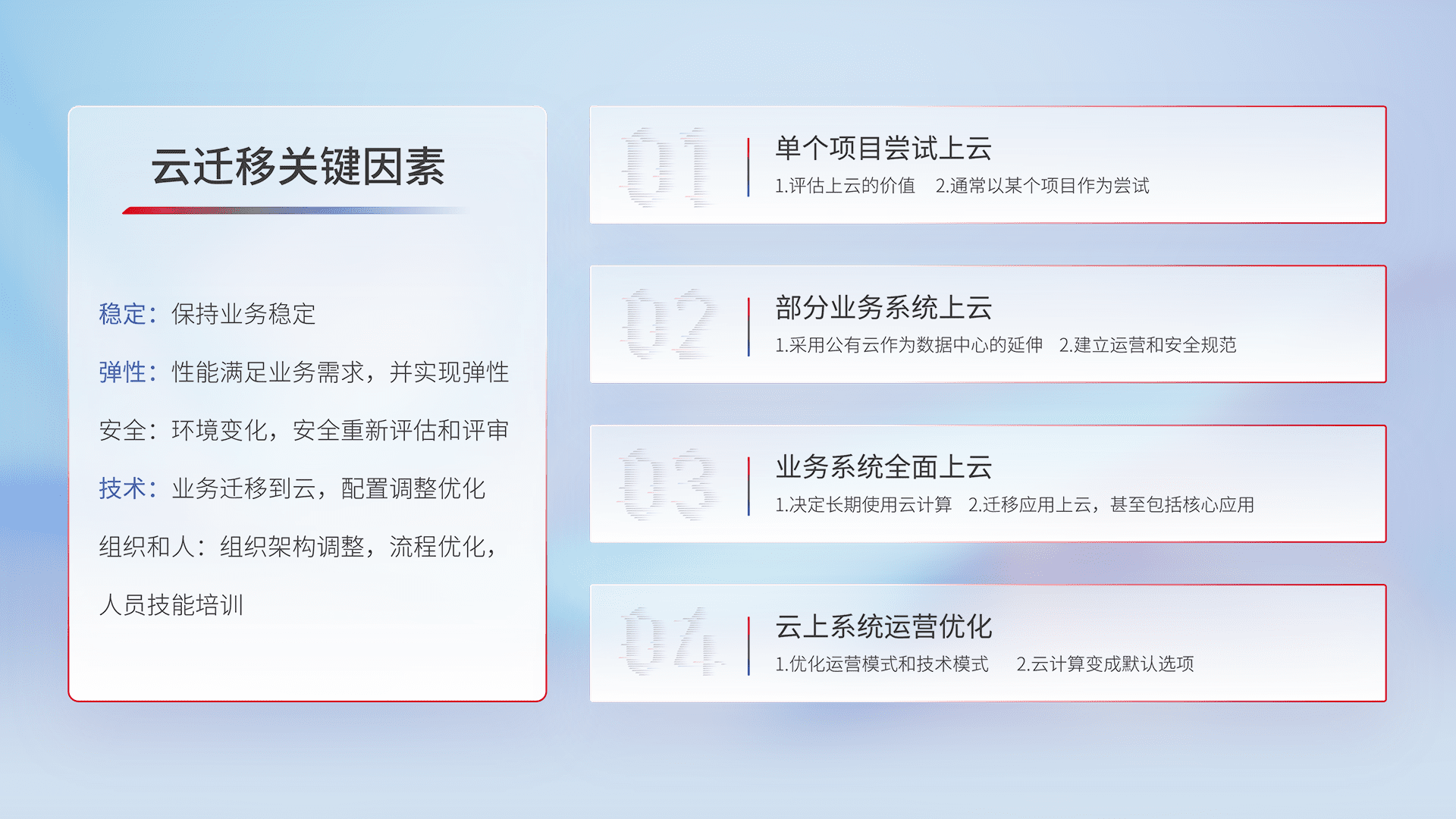 结合实际业务,,,,从规划设计、、云平台选型、、、云原生改造、、、、数据迁移、、、、集成交付,,迁移全过程为客户识别最佳上云路径,,,,做好风险识别管理,,,,设计网络架构、、、、身份权限、、、安全审计合规、、、、操作审计、、日志审计、、、监控告警策略、、、、多站点容灾设计等,,,,对云上基础设施进行整体规划,,提升IT治理水平,,,以满足弹性、、、、高可用、、、、高性能的需求。。。