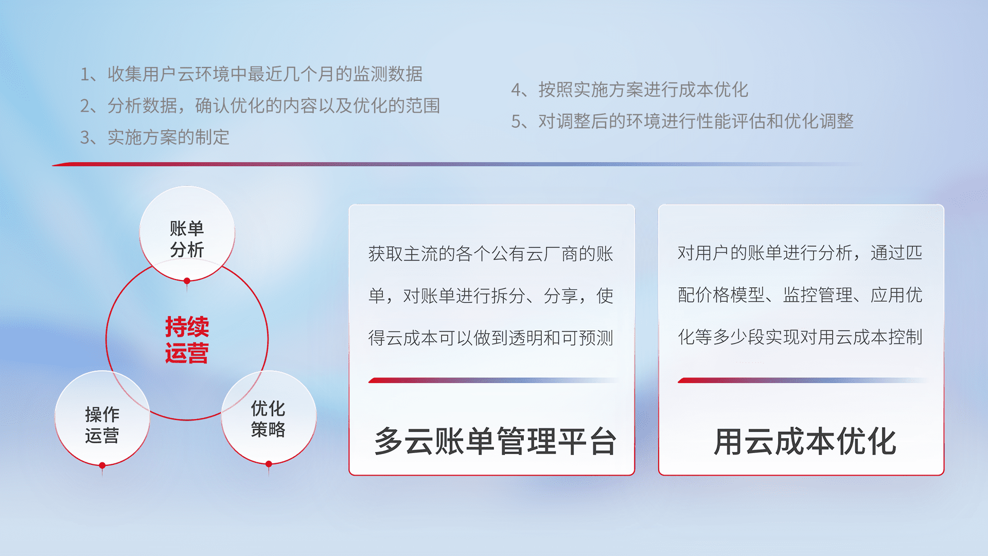 通过多云纳管,,以统一的资源数据模型把客户的云资源进行抽象和封装,,进而实现对多云资源的统一操作,,,,保障云资源管理的可靠性、、稳定性与可用性。。。。量身定制化运维内容,,,配置、、开发运维、、、补丁管理、、、备份、、、、监控、、、、认证和访问管理、、、审计和日常巡检等,,保障在用云过程中的可靠度,,,稳定度以及高可用率。。。
